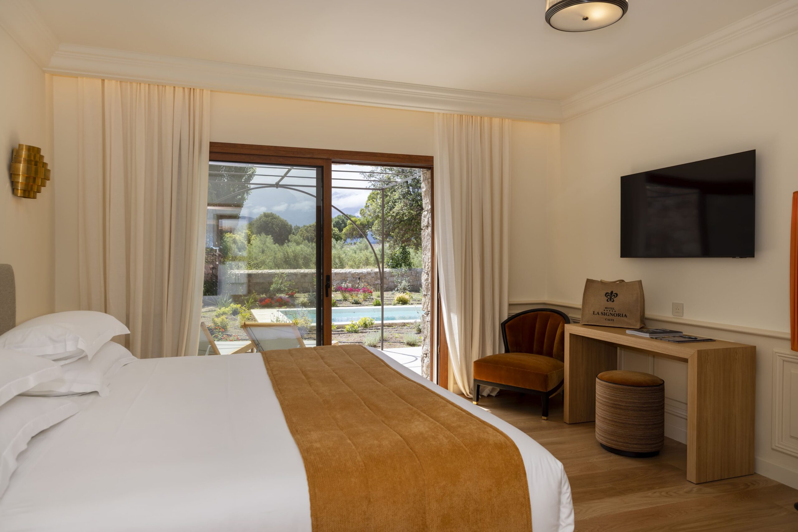 Von einem Gebäude zum anderen erzählt La Signoria vom Lauf der Zeit durch einen subtilen Dialog zwischen architektonischem Erbe und zeitgenössischen Einflüssen. Die historischen Linien vermischen sich mit einer natürlichen Eleganz, inspiriert von den Landschaften der Balagne und der Lebensfreude von Calvi. Alle Zimmer und Suiten öffnen sich ebenerdig nach außen. Terrassen oder Balkone, nach Süden oder Südwesten ausgerichtet, bieten einen beruhigenden Blick auf den Park, die umliegenden Hügel oder die Berge, die den Horizont von Calais zeichnen. Eine ständige Einladung, langsamer zu werden, durchzuatmen, zu betrachten. Die Einrichtung, die als Ode an Farbe und Patina konzipiert ist, zeugt vom Talent und Feingefühl von Marie Ceccaldi. Antike Möbel, sorgfältig ausgewählte Objekte, edle Materialien: Jedes Zimmer, jede Suite, jedes Apartment und jede Villa versprüht einen einzigartigen Charme, ohne protzig zu wirken, und bietet gleichzeitig den Komfort und die Leistungen, die man von einem 5-Sterne-Hotel in Calvi erwartet. Zwei Zimmer sind für Personen mit eingeschränkter Mobilität ausgestattet.
